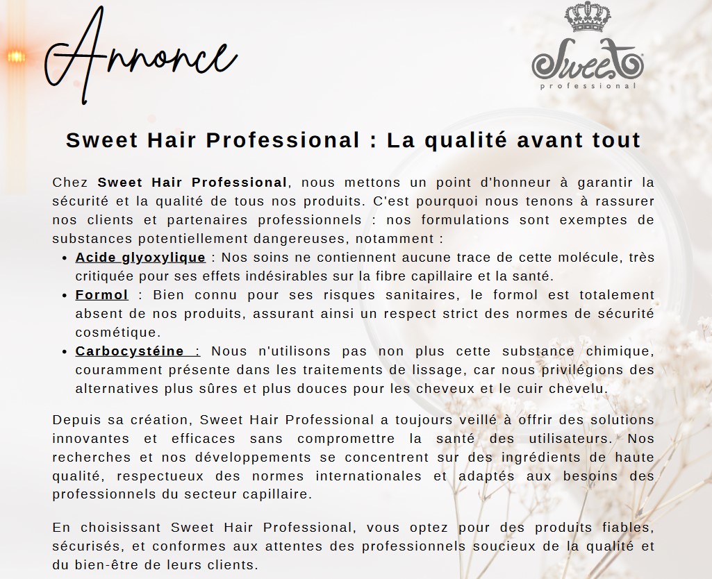 Suite à une information concernant des produits toxiques contenues dans certains produits de lissage brésilien, nous vous confirmons que nos produits garantissent la sécurité de nos clients. Notre fournisseur Sweet Hair Professional a récemment publié le communiqué ci dessous afin de rassurer ses consommateurs.